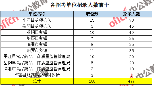 从招录单位来看,平江县乡镇机关招录人数最多,占岳阳地区招录总人数的14.68%;其次为岳阳县乡镇机关,招录人数占岳阳地区总数的9.43%。